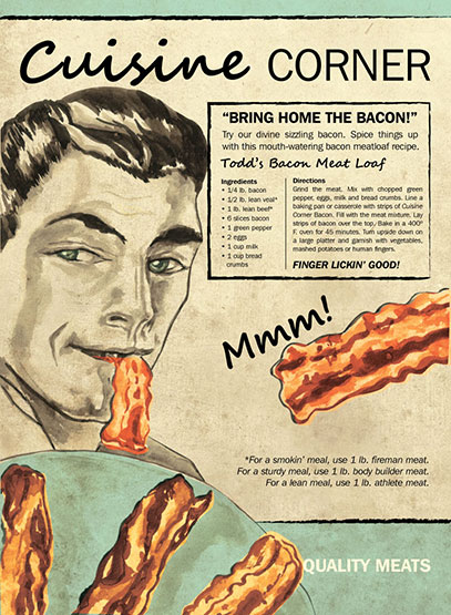To tie into meat and nostalgia, a few months ago I was asked to create some prop recipe posters for meat in a vintage style. The posters were meant to have eery undertones of canibalism, so here is a made-up recipe for “Mrs. Lovett’s Meat Souffle” More to come. Return to top.