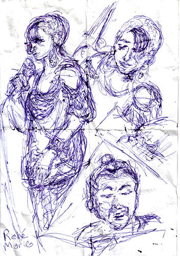 I’m going to start walking around Manhattan with a bachelorette sash on, apparently you get free alcohol! Who knew. What an insane weekend it was and I’m buzzing with some possible new life altering developments that are rapidly unraveling but in the hustle and bustle, on-the-go, no sleep whirlwind of the weekend, I want to slow down for a second and focus on the inspirational energy of musicians. I have been rather numb for months, tired, upset and bored of an unaltering monotony with little energy to draw. While I was sipping free champagne and happily listening to René Marie, I found myself scrounging through my purse in the dark for a pen to draw on my napkin. I just wanted … needed, to doodle.