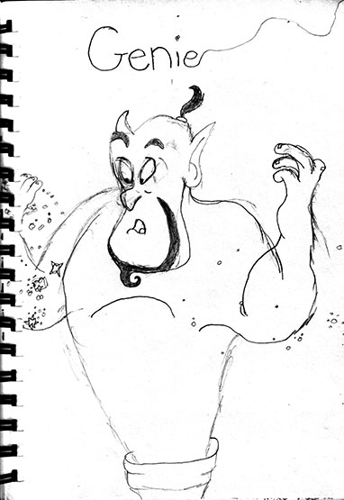 A whooole newwww yeeaarrr. As a belated holiday gift, I had the pleasure of seeing Broadway’s Aladdin in all its’ Swarovski crystal sparkly glory. It was a fun, magical show and as talented as the cast was, I’ve got to say, the true genie-us is the late great Robin Williams. I’m still in shock and denial from last year’s tragic news and with him on the mind, I decided to pull out this ancient doodle from I believe 1998 when I was 11 years old. I loved Aladdin’s genie then, and I still do now. Here’s to you Robin (and I hope to create a bigger, better tribute later in the year). Also, Disney on Broadway, you never disappoint!