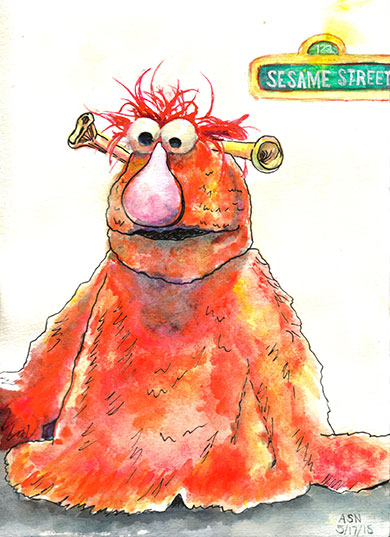It has been a city filled week with lots of exciting events including Aladdin, Bubbles, promising conversations, cocktails, great company and a heart-warming exhibit. With a happy heart, and best friend by my side, we caught the last half hour of the last day of an exhibit : “Somebody Come and Play,” This Lincoln Center Library exhibit featured a history of Sesame Street and original muppets/Sesame parapheralia. Forever moved by my admiration for Jim Henson, it was so surreal and gratifying to get to walk right up to Snuffaluffagus, Big Bird and many more childhood friends. Even motionless, the muppets seemed so life like as if I was visiting my old neighborhood (not that I physically grew up on Sesame Street but a part of me feels like I did lol). Anyway, captivated by all of it, I just had to draw/paint at least one. Hope all you Sesame Street fans enjoy this Honker. |