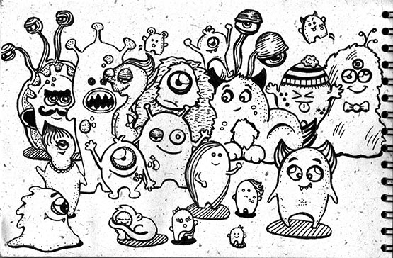 So 2014 has come and gone which made me realize … oh sh*t, it’s that time again for my annual car inspection. One resolution from last year was not to get another ticket for being oblivious to my windshield sticker (even if it was only by a day but wow, people are ON that). Anyway, while sitting for what felt like an eternity to take care of some routine car maintenance, I began doodling these goofy lil monsters. The page started out with the intention of making one or two but as the hours passed, the monsters multiplied and well … here is the result. Stale waiting rooms should always be equipped with pencil and paper. It’s a good thing I brought my own. :)