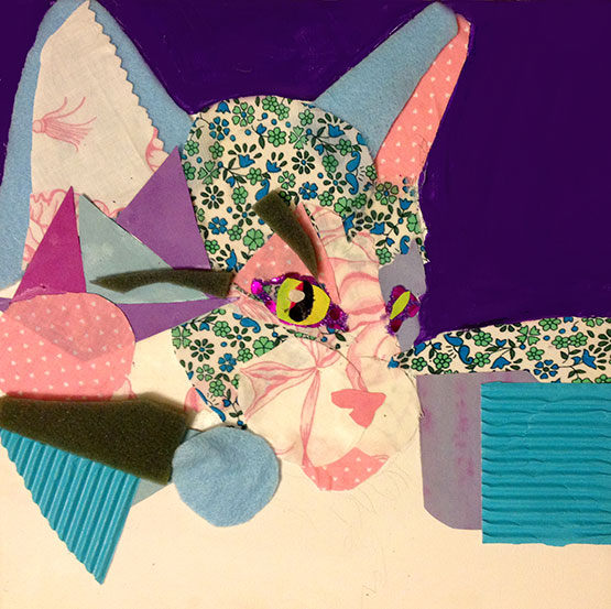 While I am embarking on this new journey of a job, I am currently wrapping up teaching a session at PS98 for Ashcan Art Studio. It is exhausting to teach six K–2 classes in a day, even if just once a week. I tip my hat to all those teachers out there, I don’t know how you do it every day. The amount of preparation is pretty intense and I am running real low on energy and sleep but I thank my lucky stars that I get to work with amaaazing kids. I believe there are 108 kids I have been teaching, and every single one of them has been delightful! I’m astounded and overjoyed how well behaved and excited everyone seems to be to come to art class every Wednesday! The lessons for this unit are focused on tactility and motion. The kids have done an incredible job on their “touching” pet portraits. Actually, many of their projects are far better than this quickly thrown together demo of my cat using a variety of textured materials, in a cubist manner on canvas.