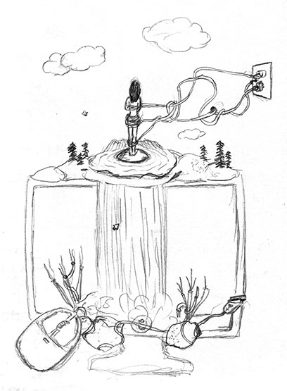 My tropical paradise of a vacation ended about a month ago but I still daydream of adventurous waterfalls and the sun-kissed outdoors. Since I have returned, it has been back to work and I find myself addicted to my computer and phone and while I want to, I can’t look away! It seems as though life cannot function here unless plugged in to the nearest outlet. I miss being disconnected but while I toss n turn awake, I can ease my screen-printed eyes with a doodle.