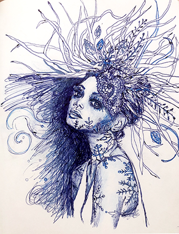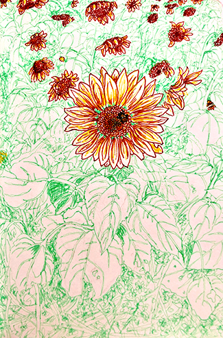 A lovely day frolicking through fields of sunflowers! I took a day trip with my beauteous older sister for an afternoon of fresh air, flowers, face paint and wine. Our parents joined for dinner and it was all very refreshing to have a responsibility free day with family, vibrant yellow petals and blue skies. I started this line drawing to capture the relaxed feels and got carried away filling the page.