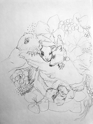 Eeeeee what fuzzy baby filled adventures! Over the last few weeks I’ve had the opportunity to hold baby squirrels and kittens. Due to some unforeseen circumstances, a friend of mine has found himself to be a squirrel daddy doing an excellent job raising 3 brothers to eventually go back to nature. I’m so proud of his superb parenting skills and excited I got to hold the tiny fluffs. After participating in a kitten skillz class the same week at the ever so lovely Brooklyn Cat Café, I discovered, newborns of any creature are alarmingly fragile and so many animals are without homes. Be kind to our four legged better halves. This super rough doodle was never quite complete but perhaps an idea for a later watercolor?