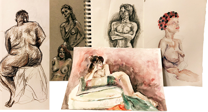 My fourth drawathon! My friend and I lasted a good 9 hours this year, we could have lasted the entire 12 but decided it best to get home while we still had the energy to do so. The Pratt Drawathon is always such a rewarding, smoothly organized event with professional live models throughout various rooms in different length poses. For the first year, I explored the longer pose rooms. I have always shied away from any pose beyond 20 minutes intimidated by the pressure of wanting to create something great without the excuse of time limitations. I’ve always had this nagging voice in my head saying, you have to get the figure in quickly, if you cannot before time runs out, you fail…like a sadistic art game. Therefore I always stayed mainly in 1-2 minute or maybe up to 10 min poses to practice. I still think it is important to get the gesture of a figure in quickly to allow time to develop details but what I did not realize was how much more soothing life drawing can be giving yourself that added time. I attempted some hour and 3 hour poses which I have never before done and did not know could be done. These models were so impressive, staying statuesque for up to an hour at a time, barely blinking without movement beyond the occasional involuntary muscle twitch. It is also amazing how quickly 9 hours can pass with such intense focus. I’m already looking forward to next years and perhaps continuing some unfinished sketches from the night.